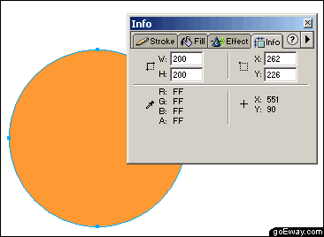 一、 在工具面板中,選擇 工具,按住shift鍵,畫一個正圓。在info面板中設置圓大小為200*200。填充色為桔黃色。