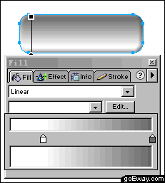 二、選擇這個圓角矩形,打開fill面板,填充類型選為linear,打開edit按鈕編輯漸變色帶,如下圖所示,色帶有白和黑組成。三、設置完漸變色后,打開effect效果面板,類型為inner bevel,在其下拉菜單中選擇smooth,深度選為7,其他的按默認的設置,這樣基本的框框就做好了,看下圖所示。 四、再用矩形工具做二個矩形,其中一個矩形需要在其object面板中設置其roundness為30。顏色此時隨自己喜歡,為了看得清楚,為了圓角矩形我用黑色填充,直角矩形為灰色填充。五、全選二個矩形,使用菜單modify->combine->punch命令,執行命令后,形狀如下:六、打開fill面板選用linear類型進行填充,編輯效果及漸變方向如下圖所示。七、把這二個形狀按如下位置放置。八、用工具面板中的文字工具輸入文字。你可以輸入自己需要的文字。九、把文字放在按鈕的上面。這個按鈕就全部完成了。