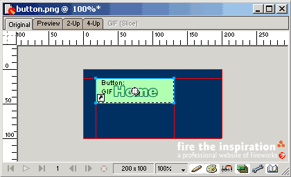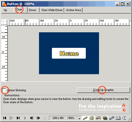 切換到over狀態下,點擊copy up graphic,fireworks直接將up狀態下繪制的圖形復制到over狀態下,并會保持所有的可編輯屬性,如果你需要更精細的加工,可以打開onion skinning使up狀態下的圖形淡淡出現,以做參考。在這里,我們將home字體的顏色改變。