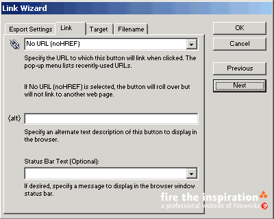 最后,我們切換到active area,在這里可以設定與鏈接有關的參數,所有設定的內容最后都會輸出成標準的html代碼,我們要做的只是簡單的將輸出的代碼復制到網頁中的相應位置。set active area automatically會自動設置一個切割,切割的大小與按鈕的大小是一致的,建議使用這個設置,然后點擊link wizard進行最后的設置。
