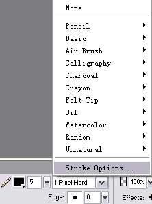 在工作區(qū)域下方的properties面板上設(shè)置邊框色為黑色,點(diǎn)擊筆觸類型的下拉框,在下拉菜單中選擇stroke options...(如圖6)。