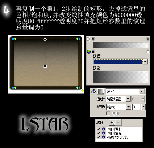 四、再復制一個第一、二步繪制的矩形,去年濾鏡里的色相/飽和度,并改變線性填充顏色為#000000透明度80-#ffffff透明度60并把矩形參數里的紋理總量調為0