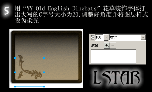 五、用“yy old english dingbats”花草裝飾字體打出大寫的c字號,大小為20,調整好角度并將圖層樣式設為柔光