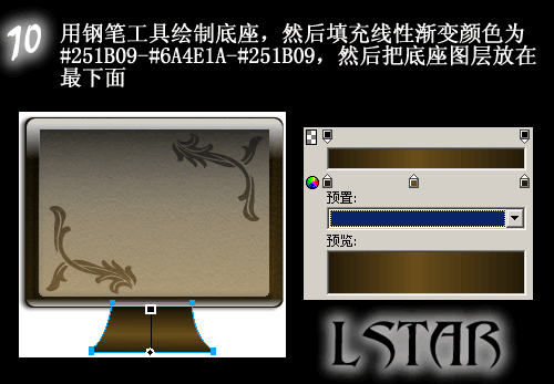 十、用鋼筆工具繪制底座,然后填充線性漸變顏色為#251b09-#6a4e1a-#251b09,然后把底座圖層放在最下面