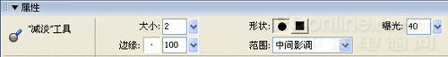 6、選取“圖像編輯”面板上的“減淡”工具,同時在屬性檢查器上作如下圖所示的設置,注意“范圍”選擇“中間影調”,“大小”不要太大,“曝光”數也不要太大,具體設置見下圖: