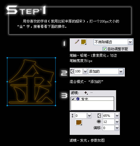1 用你喜歡的字體(我用比較豐厚的超宋),打一個200px大小的“金”字,接著看看下面的操作。