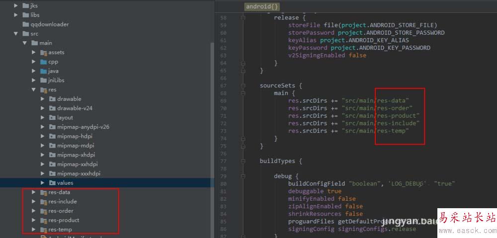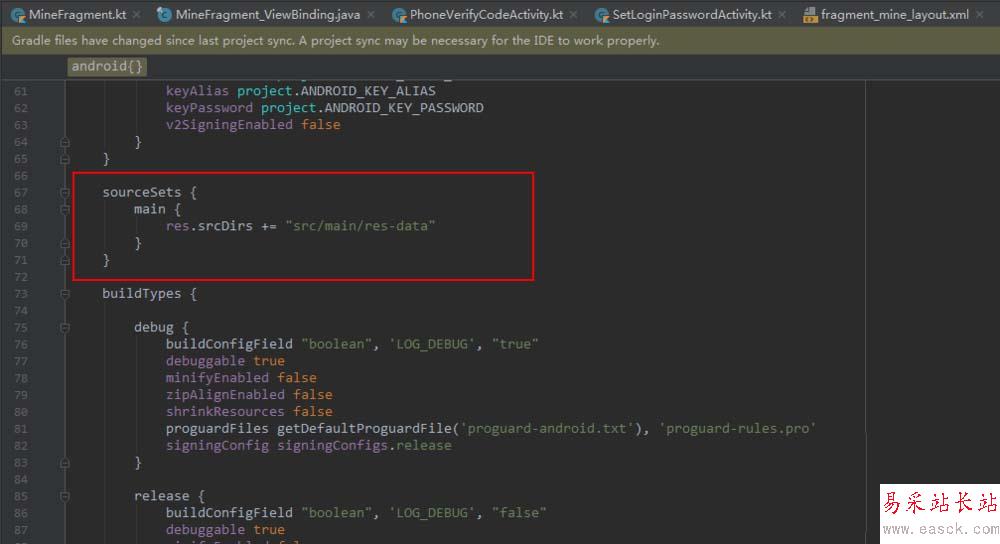 4、找到項(xiàng)目的build.gradle文件中添加資源集路徑配置。如圖