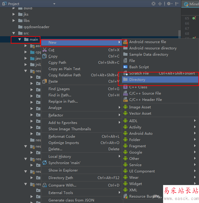2、在app模塊的main路徑下的使用“右鍵”找打創(chuàng)建文件夾功能。如圖