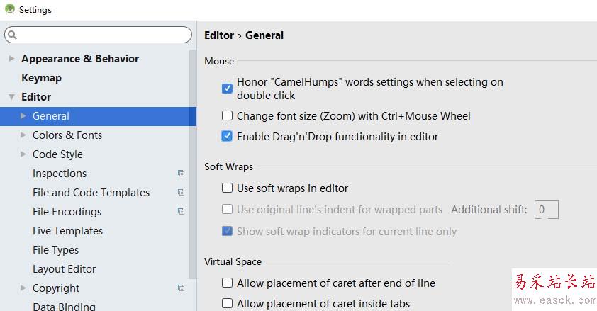 2、在設置頁面的左側菜單列表中,展開Editor菜單,然后選中General菜單(只是選中,不需要展開)