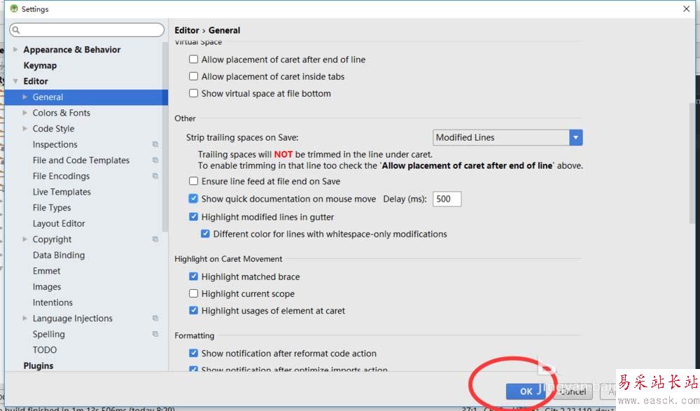 5、點擊右下角OK按鈕,關閉設置界面。此時光標移動到代碼上應該就會有提示框了。