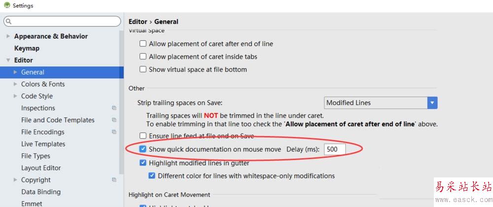 4、選中Other下選項,“Show quick documentation on mouse move”。選項后面還有相應的延遲時間設置,即設置光標移動到代碼上多久后顯示提示框,注意單位是毫秒。