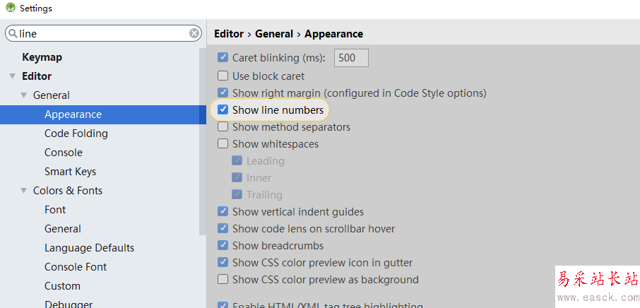 3、在設置頁面左上方的輸入框中輸入“line”,按回車鍵搜索。然后選擇Editor→General→Appearance,選中右邊的Show line numbers