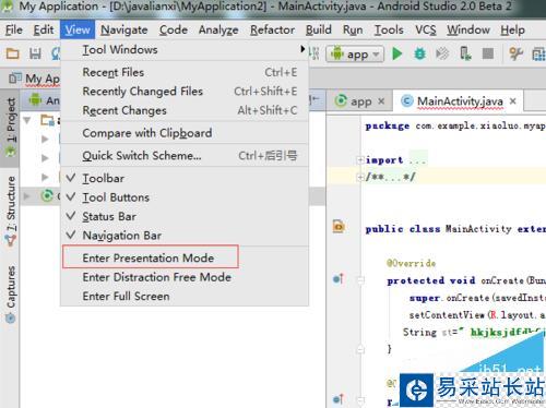 進行使用的Android studio中進行使用的編輯器中都是需要對代碼進行演示給人看的,就需要對代碼的進行使用代碼的演示的功能進行開啟代碼的演示的功能,就可以對代碼很多做演示,用于切換代碼的演示的不同的功能。