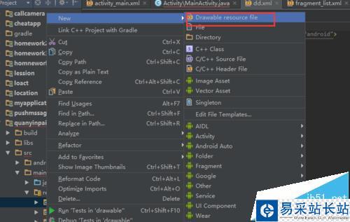 1、找到需要新建xml 的module 下的drawable文件,在此目錄下右擊drawable,選擇Drawable resource file,具體路徑為app-->src-->res-->drawable,右擊操作順序為 New-->Drawable resource file