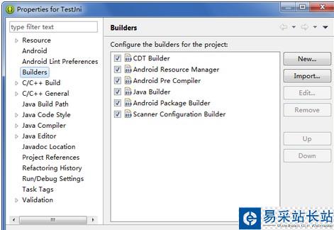 如果工程里面已經有jni目錄了,但是沒有配置C/C++的編譯器,高手們可以自己添加Builder,對于我這種愛投機取巧的小菜鳥,工程右鍵菜單,新添加一個空白的so,然后再刪除,CDT Builder和Scanner Configuration Builder就出來了。