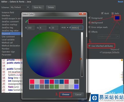 7、在修改顏色前,首先確保不勾選“Use inherited atrributes”,再點擊顏色框,最后在彈出的顏色選擇對話框中選擇自己期望的顏色,點擊choose選擇。