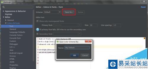 2、此時,需要通過點擊“Save as”來新建一個Scheme,新方案將以原方案為基礎修改為你喜歡的風格。包括字體、字體大小、行間距、代碼顏色等設置。按下ok后,是不是可以修改字體大小啦?