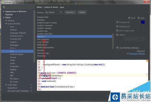 6、那么,Colors & Fonts>Java,點擊要修改顏色的代碼字段,則對應的代碼字段類型將被選擇,如代碼字段“interface”對應“keyword”類型,右邊即是對“keyword”類型字段的指定設置。