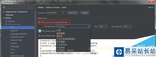 1、首先在菜單欄找到File菜單,然后File>Settings>Editor>Colors & Fonts>Font,準備修改字體。不幸的是,Android Studio自帶的Scheme是不允許修改字體的,如下圖所示。