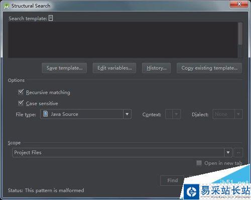 5、這樣就會(huì)彈出了strutural search的選項(xiàng)框,然后在search templat中輸入框中,進(jìn)行輸入搜索內(nèi)容,點(diǎn)擊“find”的選項(xiàng)菜單。