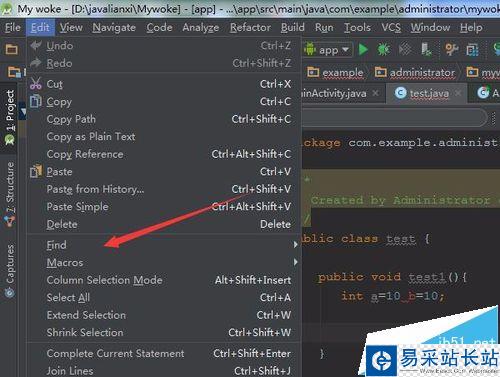 2、光標(biāo)選中完成之后,進(jìn)行點(diǎn)擊Android studio中的菜單中的“Edit”的選項(xiàng)。