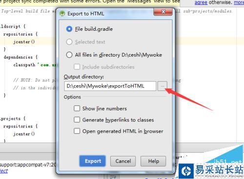 4、彈出了一個export to html的選項框中,可以在output dirextory中進行選中需要把文件導出路徑進行選擇,然后點擊“export”的選項。