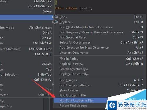 4、這樣就會(huì)彈出了一個(gè)下一級(jí)菜單,進(jìn)行選擇下一級(jí)菜單中的"Highlight usages in file"選項(xiàng)。