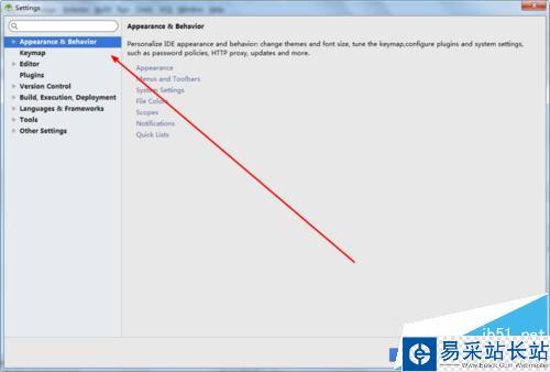 4、彈出Settings對話框,單擊展開appearance&behavior