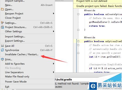 4、彈出的下拉菜單中可以看到為“invalidate caches/restart”的選項,點擊進入即可。