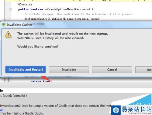 5、然后會彈出一個invalivdate caches的選項框中,根據提示進行確認,一般點擊“invalidate and restart”的選項。