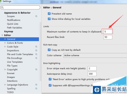5、進(jìn)入到了general的選項中之后,在limits中的maximum number of contents to keep in clipboard的更改為較大一點(diǎn)。例如改為8。