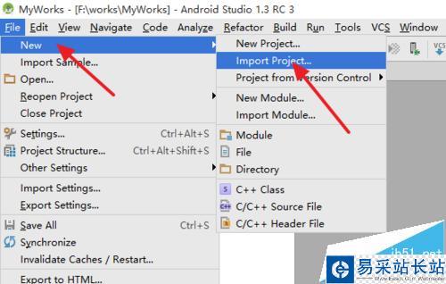 2、在下拉菜單中依次找到New— —Import Module,點擊打開項目導入窗口。注意導入的是Module而不是Project,如果是Project的話AndroidStudio會自動打開一個新的窗口編輯,那樣的話就是不Library了。