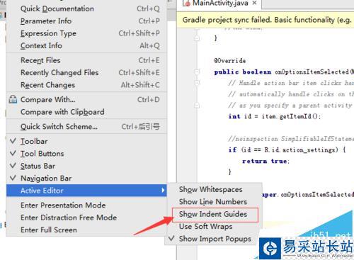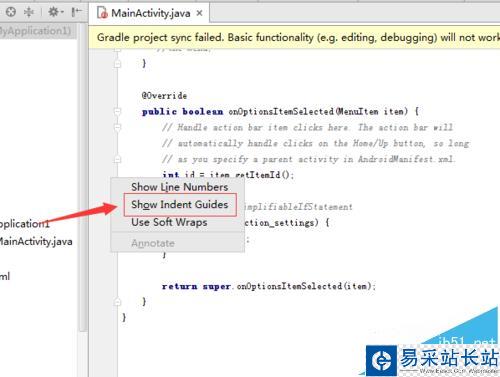 在進行使用的Android studio提供開發界面以比eclipse非常的好用的多了,而在進行使用編輯器的過程中,那么在進行對代碼中縮進提供較好功能,能通過線方式來代表是否縮進,顯示也較為明顯,效果也更佳。