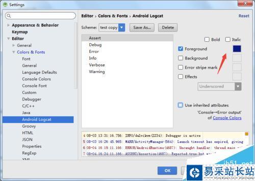 8、可以看到assert在logcat預覽中顯示為深藍的顏色。其它設置的設置也是類似。