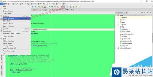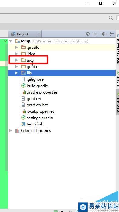 1、首先認識一下工程和模塊的組織結構圖,如圖所示,一個Project(temp)對應這兩個Module(app和lib,字體為黑體)。