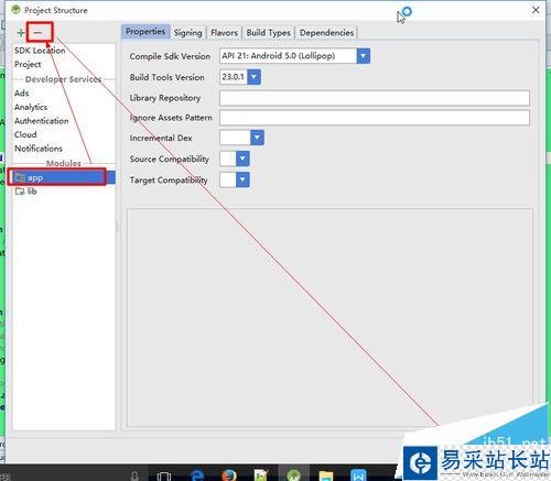 4、在Project Structure窗體中可以看到左側的Module區域,其中列出了工程所有的Module,選中要刪除的Module,然后點擊左上角的減號按鈕,最后點擊OK按鈕。