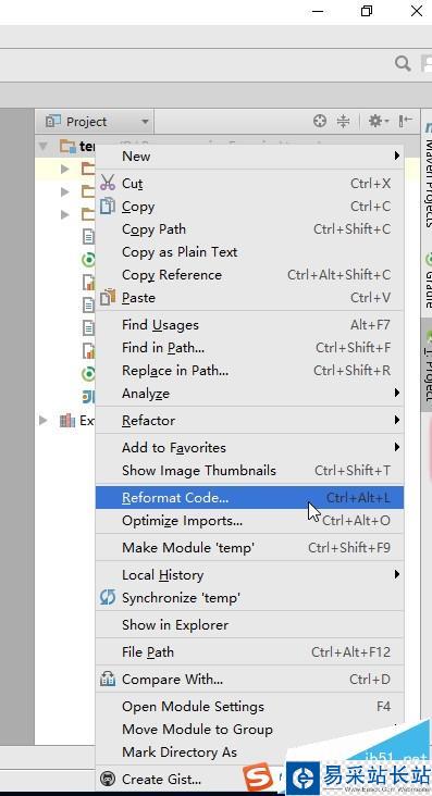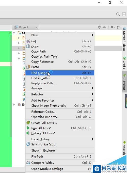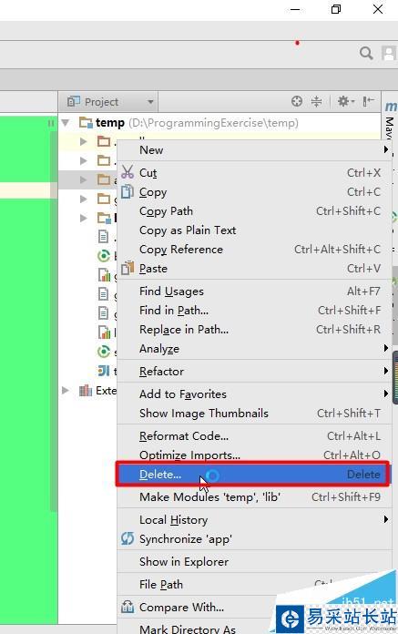 6、刪除完工程中的Module之后如果我們還想接著刪除工程,可是這時選擇工程,右鍵彈出菜單,我們發現這時候菜單中并沒有Delete的選項,那么這時候最簡單的方法就是關閉Android Studio,然后在硬盤中找到工程的文件夾,直接刪除即可。