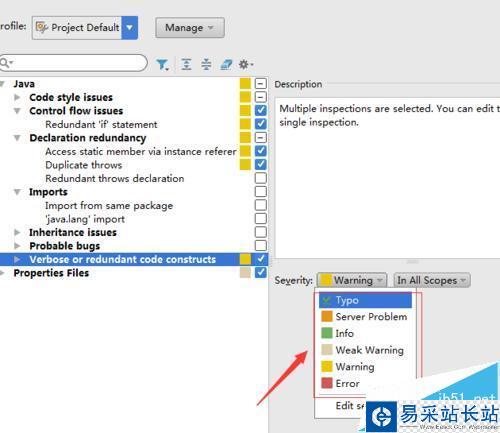 5、并進行設置檢查的安全的級別,進行點擊severity的選項菜單中的,進行選擇需要的檢查的顏色提示。