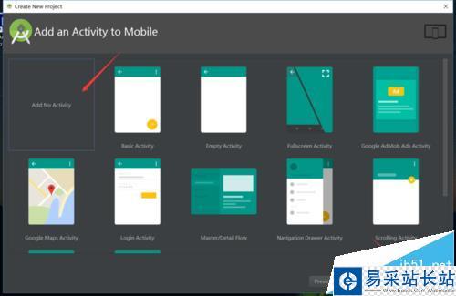 5、完成我們項目的基礎屬性后,我們會進入項目的類型選擇,Android studio給予用戶非常豐富的選擇,第一個“add no activity”,系統不會給予我們原始代碼。