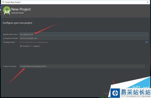 3、系統會自動彈出新建項目的設置窗口,第一個需要我們設置的是項目的名稱以及儲存位置,為了避免錯誤產生,盡量都使用英文名稱以及英文儲存路徑。