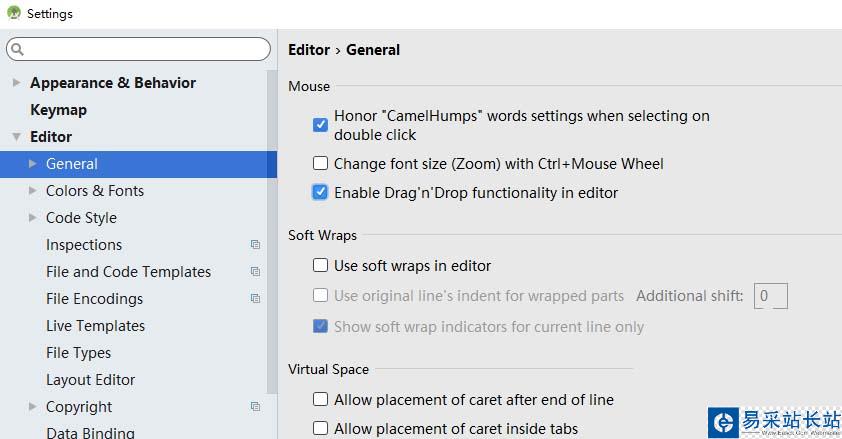 2、在設置頁面的左側菜單列表中,展開Editor菜單,然后選中General菜單(只是選中,不需要展開)