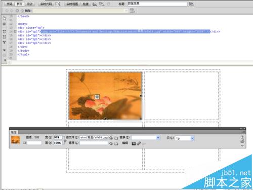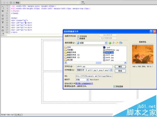 4、選擇第一div,執行插入-圖像命令,在彈出的選擇圖像源文件對話框中找到圖片所存放的位置點擊確定按鈕,將圖片導入到層中。