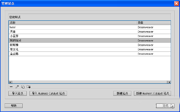 3、要打開站點,可在dreamweaver中選擇“站點/管理站點”命令,彈出“管理站點”對話框,選擇要打開的站點后單擊“完成”按鈕。