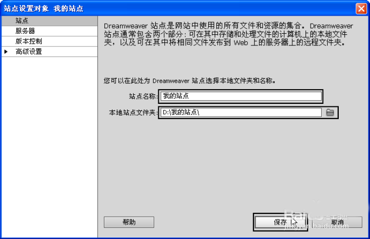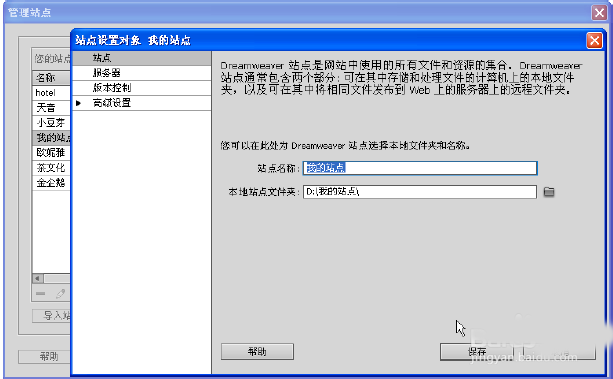 2、在彈出的“站點設置對象”對話框中,設置“站點名稱”為“我的站點”、“本地站點文件夾”為步驟1創建的文件夾,然后單擊“保存”按鈕,這時站點便創建成功了。
