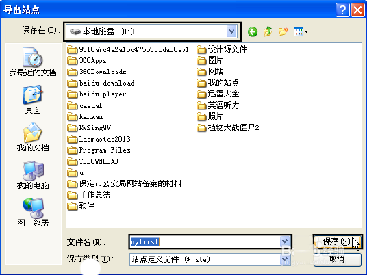7、在彈出的“導出站點”對話框中為導出的站點文件命名,然后單擊“保存”按鈕。要導入站點可在“管理站點”對話框中單擊“導入站點”按鈕,在彈出對話框中選擇要導入的站點文件(擴展名為.ste),單擊“打開”按鈕即可。