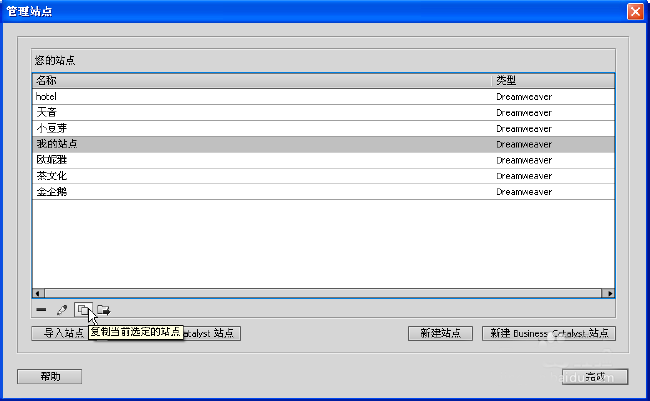 5、要復制站點需先在“管理站點”對話框中選擇要復制的站點,然后單擊“復制當前選定的站點”按鈕,在站點列表中即增加了一個新的站點“我的站點 復制”,表示這個站點是“我的站點”的副本。雙擊復制的站點可對其進行編輯。在“管理站點”對話框中單擊要刪除的站點,單擊“刪除當前選定的站點”按鈕即可將其刪除。