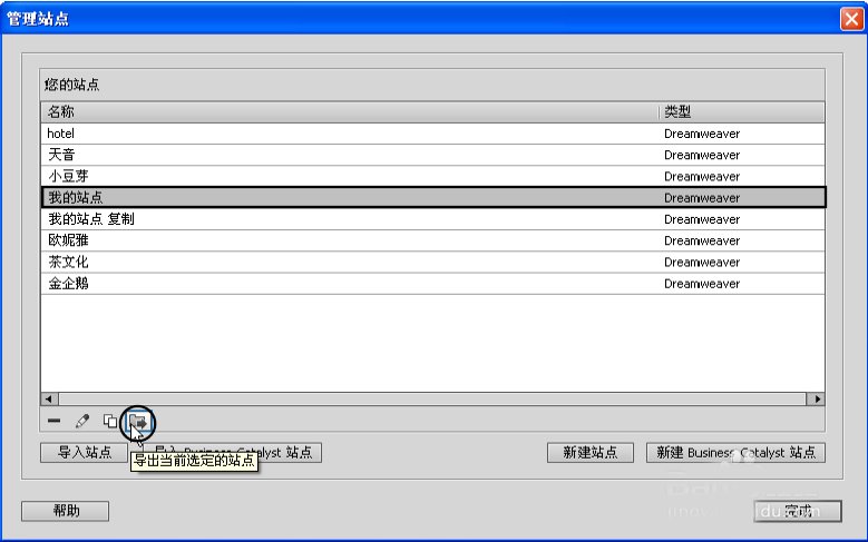 6、我們可以將站點導出為一個站點文件用于備份,待站點出現問題時將備份文件導入為一個站點,及時恢復。要導出站點首先在“管理站點”對話框的站點列表中單擊要導出的站點,然后單擊“導出當前選定的站點”按鈕。