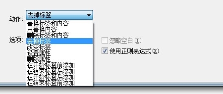 6、上面我們就把“查找”做了,接著做“替換”。彈出框的“動作”那里,選擇“去掉標簽”,就是把空鏈接的a標簽都去掉。