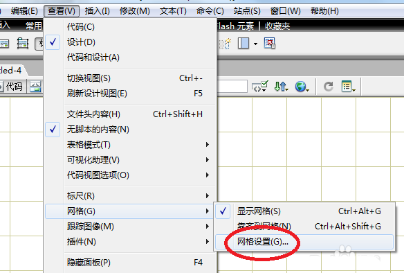 1、顯示網格。在DIV布局中首頁要顯示網格,能更加直觀的通過網格來繪制層。點擊查看/網格/顯示網格。