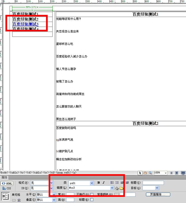 6、回到左側選中,剛剛的目錄百度經驗測試3,在頁面底部有鏈接的字樣(紅色框那里),然后把剛剛的錨點名稱(cs3)填寫進去,這里記得加“#”號。一個頁面可以有很多的錨點,這里必須要加“#”號。